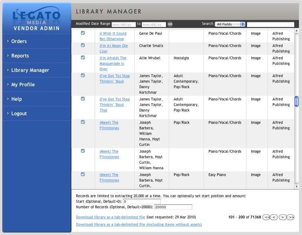 The DMC (Digital Music Center) is a powerful tool for both vendors and publishers to manage their music libraries and view reports on sales. Click here to enlarge image.