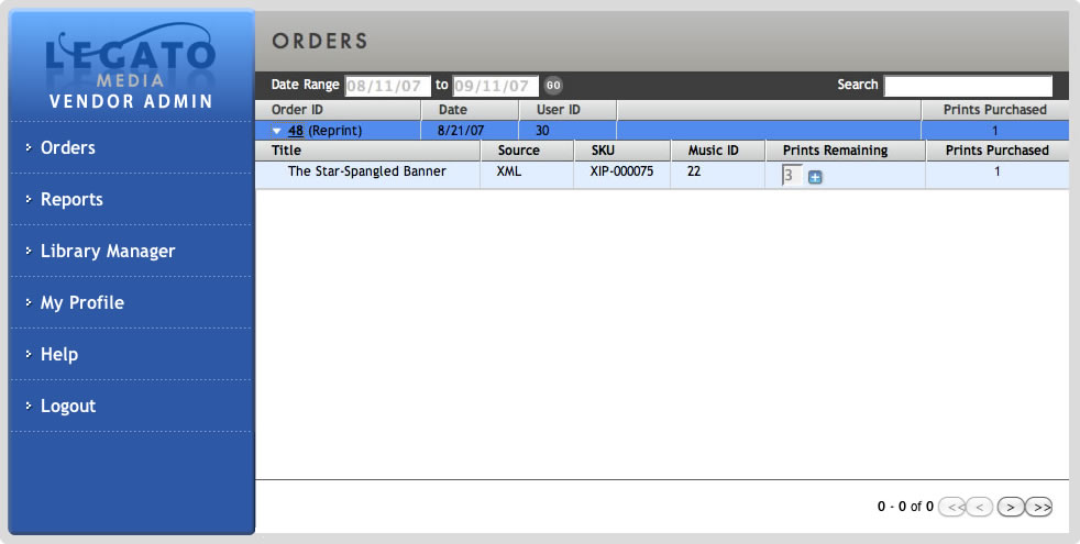 View orders by ID number, date, user ID, or number purchased. Go one level deeper and you can view the music title and specs for each order. You can even authorize reprints from within the DMC. Click here to enlarge image.