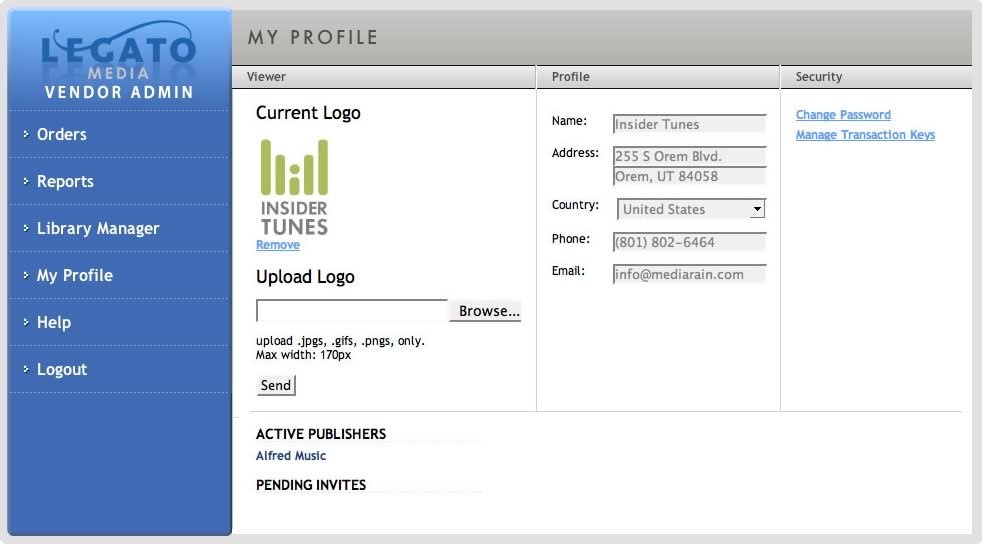 Manage your password and transaction keys in the My Profile section. You can even customize the Music Player by putting in your company's logo. Click here to enlarge image.